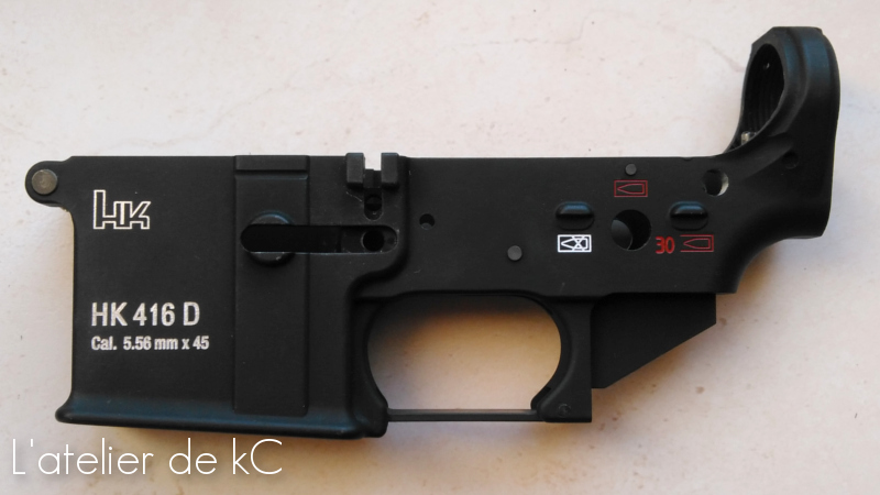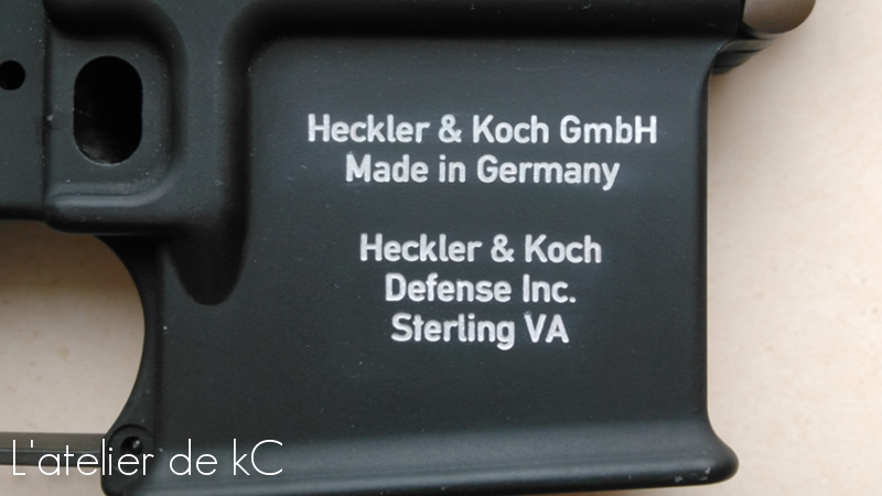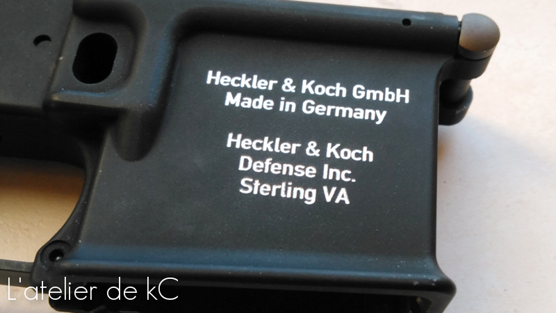 Passons ensuite au lower. Celui- ci est marqué des deux cotés du puits de chargeur. Les tracés sont plus simple car plus gros et composé uniquement de textes, mais plus long à réaliser car contrairement aux marquages par estampage type colt, ou les caractères sont « filaires », il s’ agit de reproduire des marquages initialement réalisé au laser, avec une police d’ écriture bien spécifique et un tracé « épais ». Je dois donc usiner les contours de chaque lettre, et ensuite évider l’ intérieur de chaque contours (Sauf pour le logo HK, composé uniquement d’ un contour vu sa finesse).