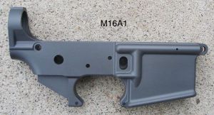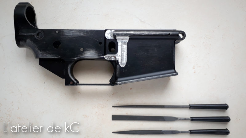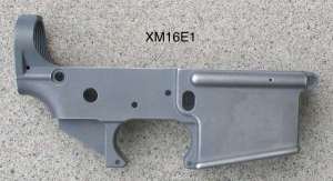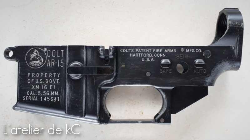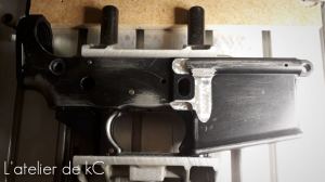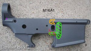Pour reproduire au mieux ce XM16 E1 en partant d’un M16, la tache qui m’incombe en plus des gravures, est qu’ il me faut usiner les renforts de la face droite du lower afin de les faire disparaitre: Ces renforts sont en effet absent sur les premières versions du M16 ( le XM16 E1 a progressivement laissé place au M16 A1 au sein de l’US Army a partir de 1967). Ces renforts furent ajouté par la suite sur les M16 A1 et XM16 E1 après les premiers retours d’ utilisation sur le champ de bataille. Il existe donc également des XM16 E1 plus tardifs équipés de renforts.