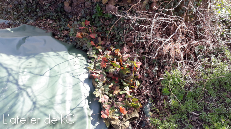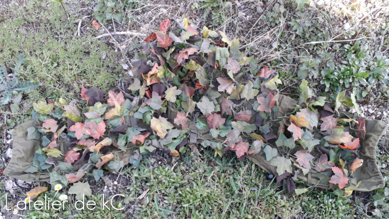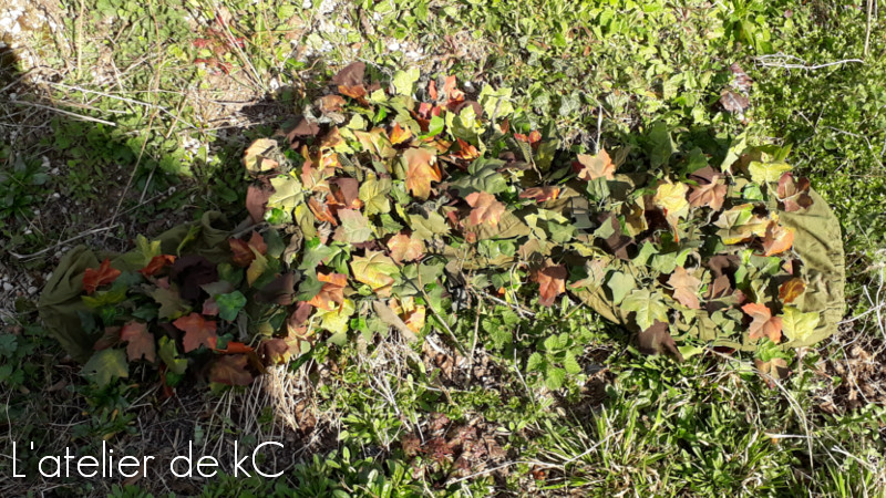 - Ajout de faux lierre synthétique afin de nuancer le type de végétation à la base du camouflage. Le lierre étant une plante très présente dans nos contrées;