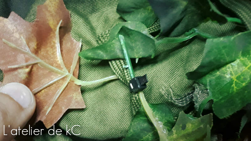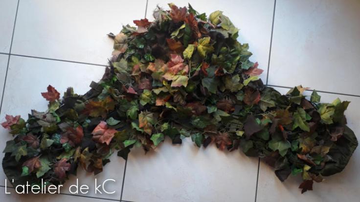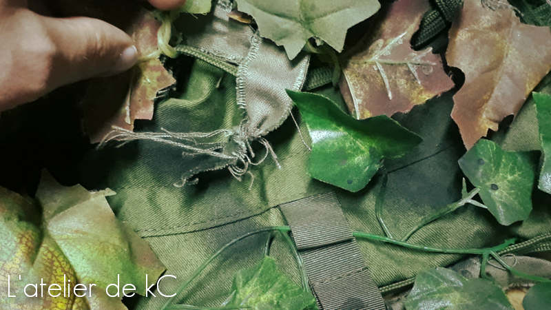 Dans mon cas, ces feuilles sont issus de guirlandes de décoration acheté chez Action pour quelques euros, et maintenu en place sur le maillage de la capuche par des colliers de serrage noir, également acheté pour une bouchée de pain chez Action.