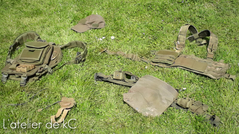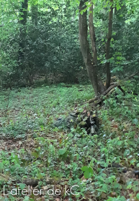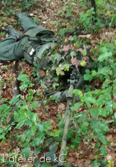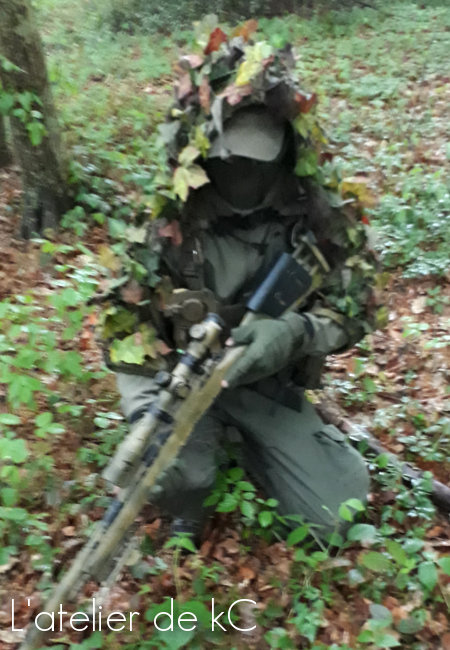 J’ ai également utilisé quelques bandelettes découpé dans un vieux treillis F1 et dans un tissu marron, noué sur les mailles de la capuche, pour simuler les brindilles et autres branche de bois mort que l’on trouve sur notre terrain.