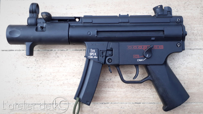 Pour rester dans cet esprit « SP 89 » que j’ affectionne (Qui est en réalité une version civile du MP5 K bloquée en semi- auto, et sans poignée verticale comme le veux la réglementation outre-atlantique d’ après mes recherches), pour plus d’ originalité et changer des traditionnels marquages MP5 K, je décide de partir sur des marquages de SP5 K. Le SP5 K est la version modernisé de ce fameux SP 89, qui n’ existe pas en airsoft ^^.
