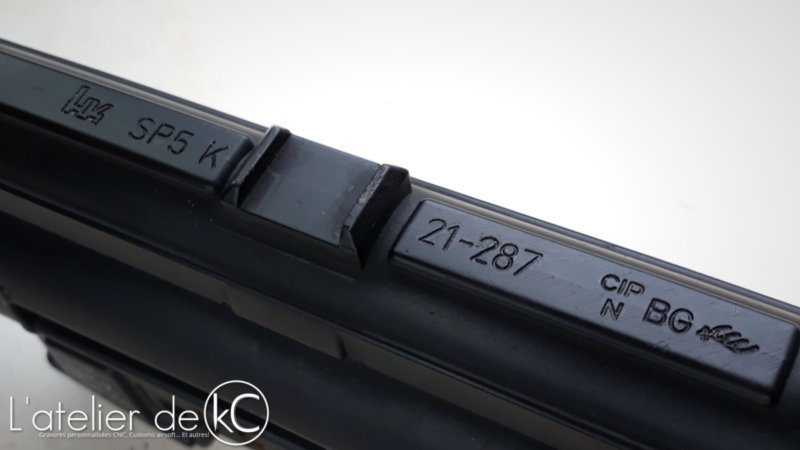 Aucun marquage, pas même le Cal. 9mm x 19, ou Kal. 9mm x 19 comme sur les MP5 teutons et tout les mp5 airsoft que j’ai pu voir (1ere subtilité! la plupart des SP5 K, destiné au marché US, sont marqués Cal, pas Kal).