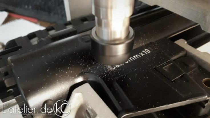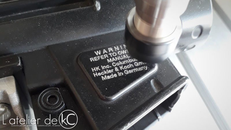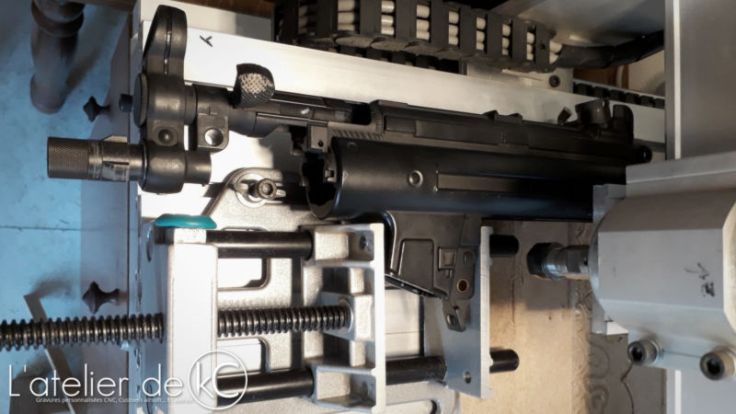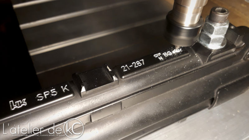 Ces gravures sont similaires à celles présentes sur les HK 416, mais en beaucoup plus petites: j’ usine sur seulement 0.05mm de profondeur, le moindre défaut et je risque de graver dans le vide (problématique déjà rencontré sur le Delta Elite, et sur la M4 « Spartan »).