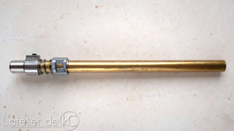 La partie la plus délicate! Je modifie directement la longueur du percuteur d’ origine sur cette réplique, son propriétaire n’ ayant pas souhaité installer de percuteur réglable. L’ énergie développée par la réplique suite à la modif sera donc définitive.