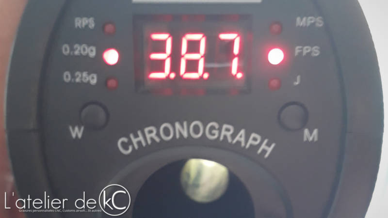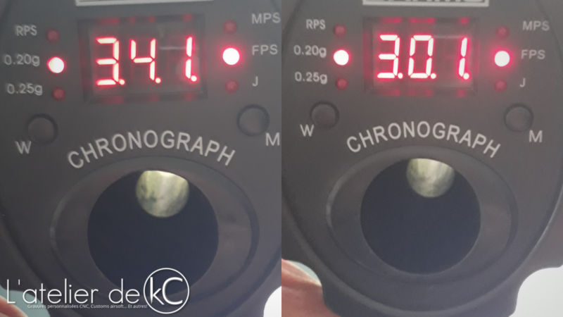 La réplique est annoncé à 1.6J sur la boite ( égale à 415fps à la 0.2g), je commence donc par vérifier la puissance développée: