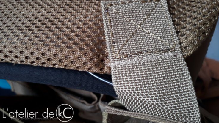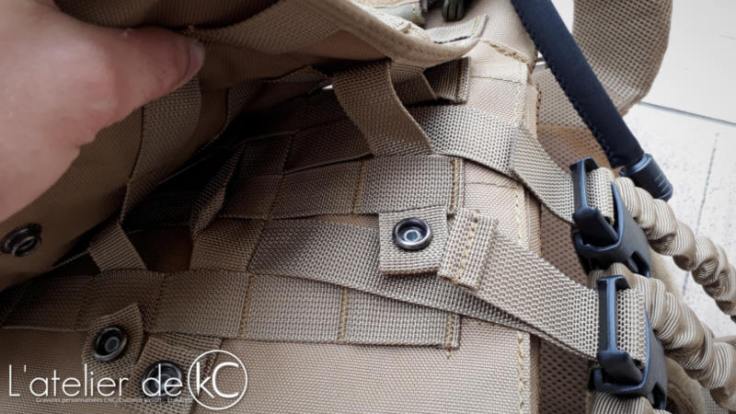 Le sac d’ inspiration « minimap » 8fields que j’ ai installé sur le PC est démuni de sangles de compressions, pourtant bien pratiques sur ce genre de sac. Qu’ a cela ne tienne, j’ en ai fabriqué une à partir d’ une sangle abdominale inutilisée, récupérée sur un autre sac à dos. La teinte est légèrement différente, mais ca fera l’affaire. la sangle est simplement « coincée » entre les passants Molle du sac.