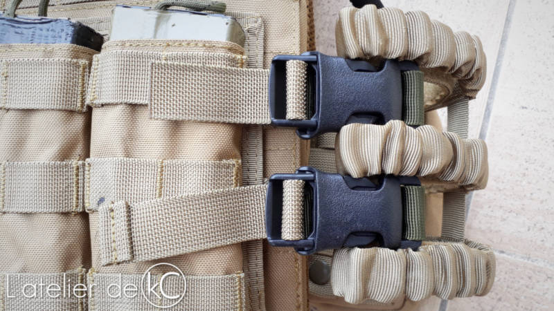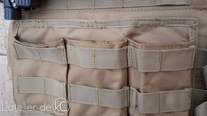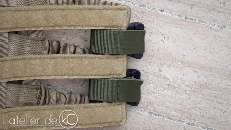 Pour adapter cette modification prévue pour JPC à mon Tactec, j’ ai utilisé des boucles QASM ITW que j’ avais eues avec un sac à dos: les parties mâles sont installés sur une sangle, que j’ai coincés dans les passants molles de la poche triple chargeur; les parties femelles sont installées sur le renfort vertical du cummerbund, juste avant la partie velcro.
