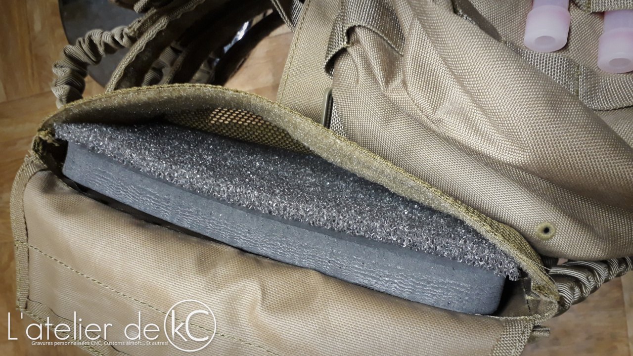 Comme indiqué dans la conclusion ci dessus, j’ ai effectivement remplacé les plaques rigides d’ origine du PC par des plaques mousses (semi-rigides) de la marque TMC; j’ ai également ajouté une sorte de mousse alvéolaire coté corps, pour aider un peu au confort et à l’ aération de l’ensemble. Cela ne fait pas de miracles, mais c’ est tout de même mieux!
