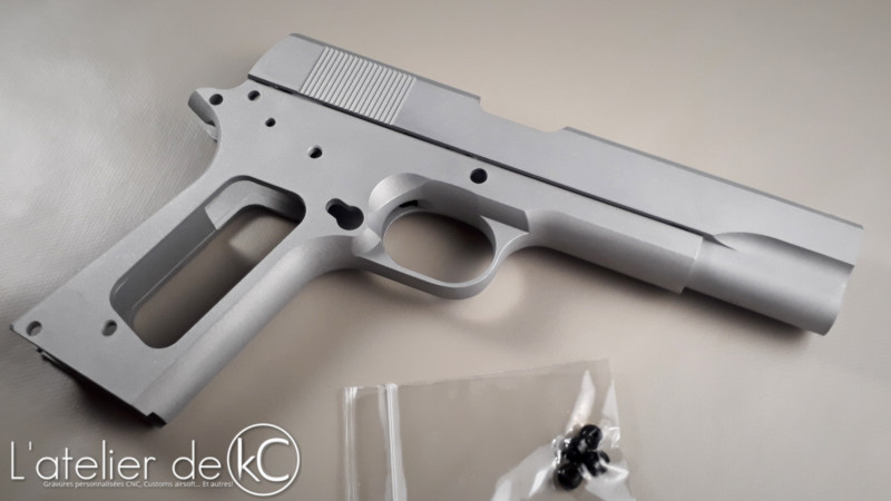 La base de ce custom sera donc un Kit Guarder pour 1911 Tokyo Marui, sans marquages (d’ oh?), finition Aluminium brut. La même base que pour le custom de Delta Elite réalisé il y a quelques temps déjà donc.
