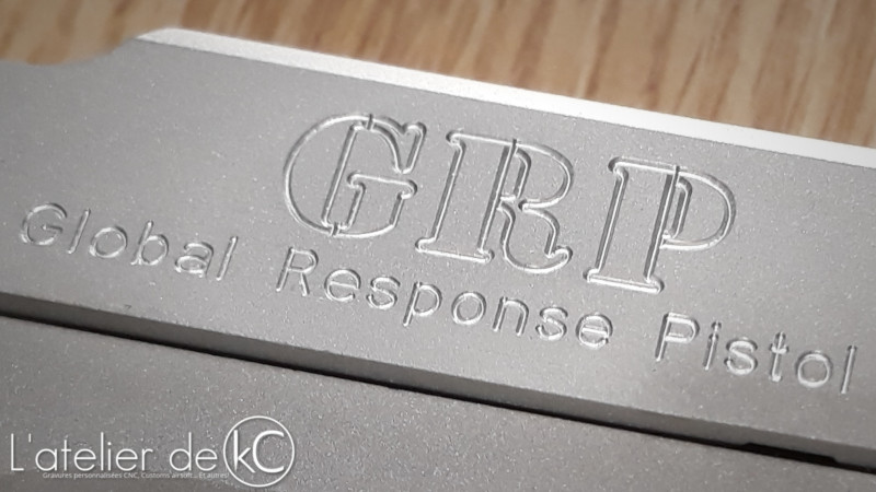 Bien qu’ elles n’ en aient pas l’ air, la reproduction des gravures de ce modèle relèvent de quelques difficultés. Assez similaire à ceux du Delta Elite, les marquages sur la carcasse sont plutôt fins en précis. Et sur la culasse, bien qu’ au contraire plutôt grosses, les 3 lettres « GRP », ont un lettrage bien spécifique type « Stencil » à respecter, avec une largeur de trait et une superposition des sillons d’ usinage bien spécifiques ( certainement lié à un procédé de gravure mécanique), délicate à reproduire. Ce n’ est pas toujours la finesse qui fait la difficulté!