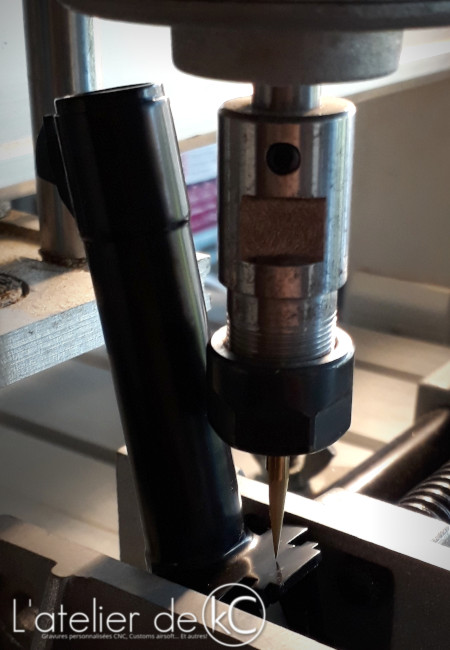J’ ai réussi à rattraper le coup et à éviter ce problème lors de la gravure sur la tranche du chargeur en réduisant ma profondeur de passes à 0.01mm (!) et en triplant la vitesse d’ avance.