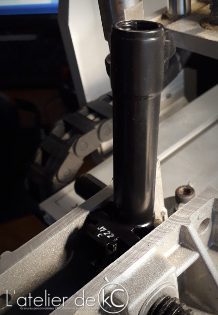 La plus grosse difficulté a donc été de réaliser le marquage du numéro de série sous le canon. En effet, la taille de la broche de ma machine m’ empêche d’ accéder perpendiculairement à la surface à graver sans venir en collision avec le canon… Et mes outils de FAO ne me permettent malheureusement pas de graver des plans inclinés. Il m’ a donc fallu ruser, aussi bien sur le programme d’ usinage, que sur l’ outil et le montage d’ usinage pour rendre cette opération possible!