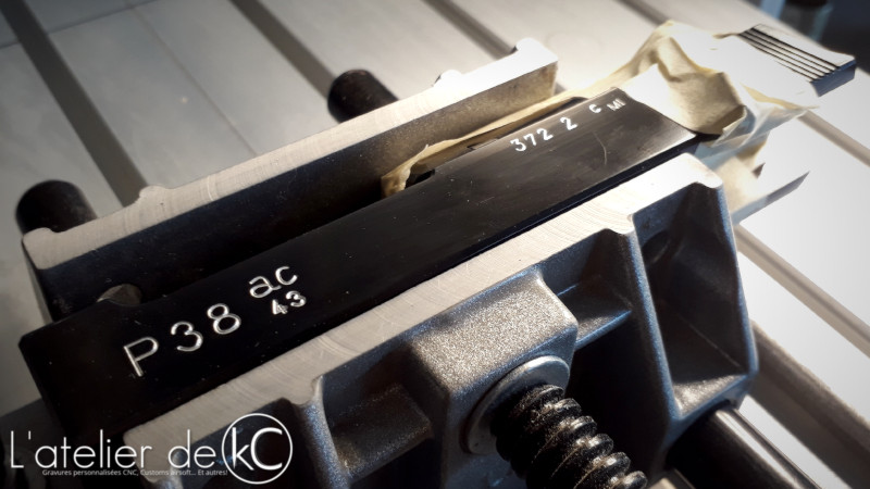 Pour reproduire l’ aspect des marquages frappés du vrai P38, en plus des soins apportés aux tracés, je vais utiliser une pointe de gravure de 60° et volontairement fausser la mise à niveau des pièces à graver pour obtenir une profondeur d’ usinage non- constante, ce qui va également provoquer une légère variation de largeur de traits. L’effet est subtil mais renforce parfaitement l’impression d’avoir des marquages frappés.