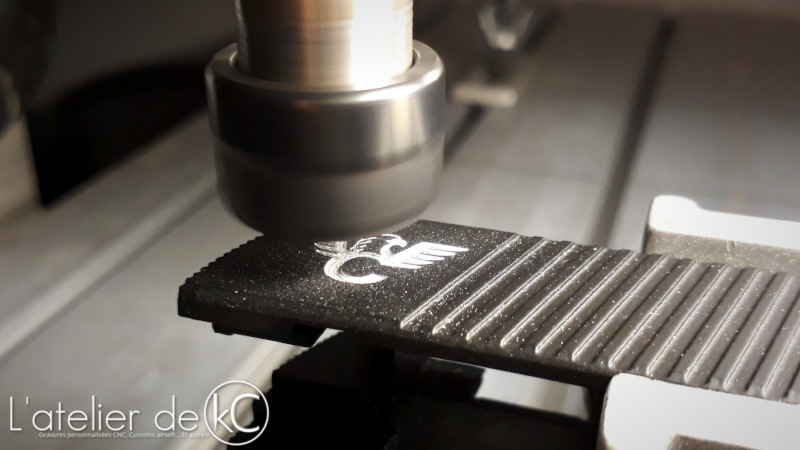 Les marquages du modèle sont peu profond, donc je limite mes usinages à 0.2mm de profondeur. Comme je m’ y attendais, le surfaçages des différents motifs et lettrage est long… plus de 6 heures rien que pour le logo de l’ aigle!