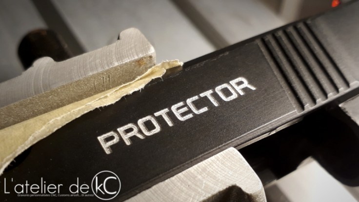 Pour les textes sur la culasse on a un peu plus de marge. Peu de variations de largeurs des traits des caractères, donc outil de 0.3mm, ce qui permettra tout de même de minimiser l’ effet « arrondi » dans les angles, tout en minimisant les temps d’ usinage.