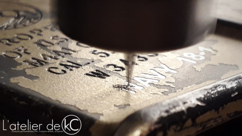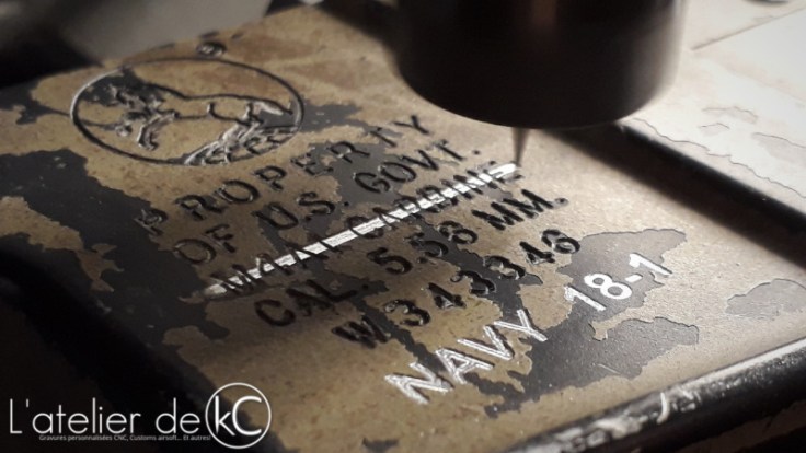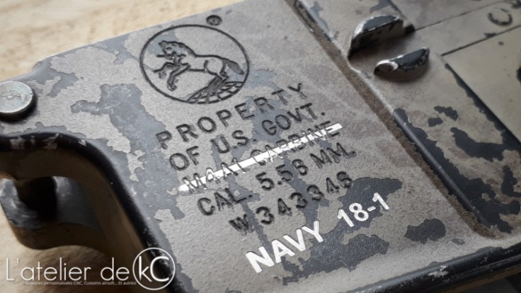 Cette dernière étape consiste à reproduire les marquages laser spécifiques du MK18 mod1. Gravure superficielle donc, avec une pointe de 0.1mm seulement pour minimiser la visibilité du rayon de l’outil dans les coins des gravures.