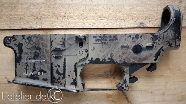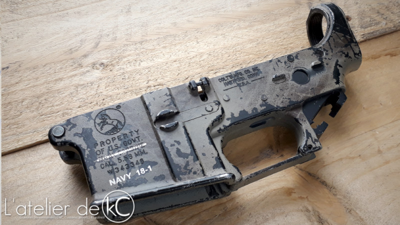 La petite particularité de ces mk18 est qu’ ils comportent donc deux types de marquages: Des marquages estampés Colt M4a1 « classiques », (Property of US Govt., etc…), comme j’ ai déjà pu en faire sur d’ autres répliques de ce type; Et un marquage laser, rajouté par la suite par dessus ces marquages initiaux, pour identifier les armes ayant été « upgradées » suivant le standard « NAVY 18-1 ».
