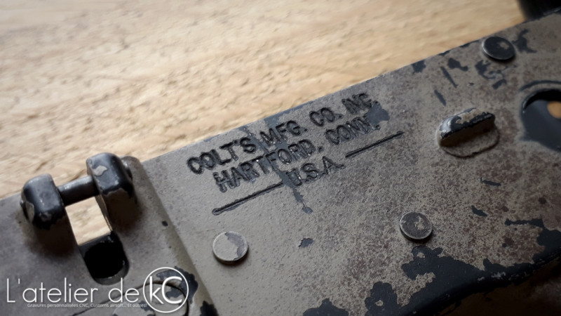 Je veille cependant à ne pas trop teinter le centre de la gravure « M4A1 CARBINE », qui est sensé être brut sur le résultat final car rayé par laser.
