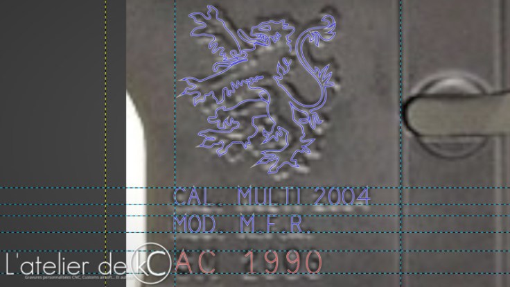 Le gros du travail de préparation va résider ensuite dans le tracé du logo d’ Olympic Arms en lui même, une sorte de griffon assez complexe à dessiner.
