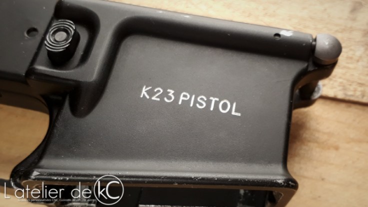 La tâche que l’ on m’ a confié cette fois -ci est de réaliser des gravures de K23 Pistol, modèle de chez Olympic Arms, sur un corps de m4 Gbbr WE.