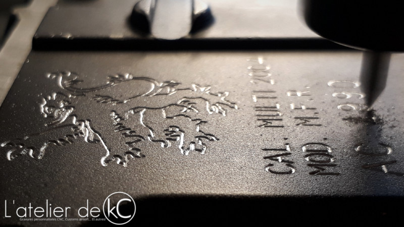 Pour ce projet, afin de reproduire correctement l’ aspect bien caractéristique des gravures d’origine, j’ ai utilisé mes pointes à graver de 60° (Comme pour le custom de Night hawk GRP réalisé il y a quelque temps). Chose qu’ il me manquait pour mon projet de Remington m870 … On retrouve en effet sur le modèle cette forme bien spécifique de sillons, usinés avec une fraise à pointe évasé.