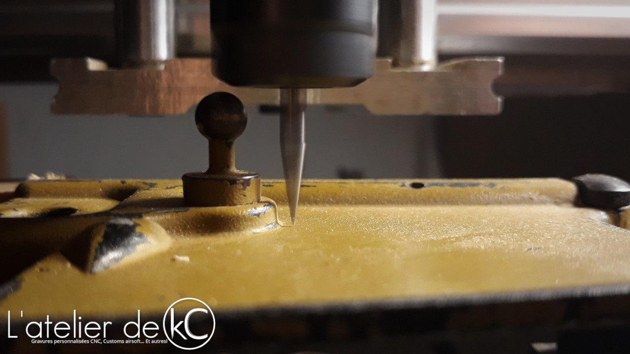 Avant de commencer, je ne voyais qu’ une seule subtilité à ce projet: le pion de verrouillage de la crosse coté droit, qui allait m’ obliger à sortir d’ avantage ma pointe de gravure du mandrin de la broche, pour avoir un dégagement suffisant.