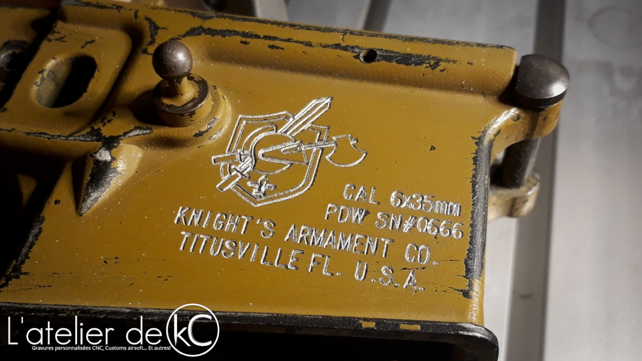 Les gravures laissées brut sur cette réplique à la peinture déjà bien usée ne sont pas des plus valorisante, mais la réplique sera ensuite entièrement sablée et repeinte (Cerakote!) par son propriétaire.