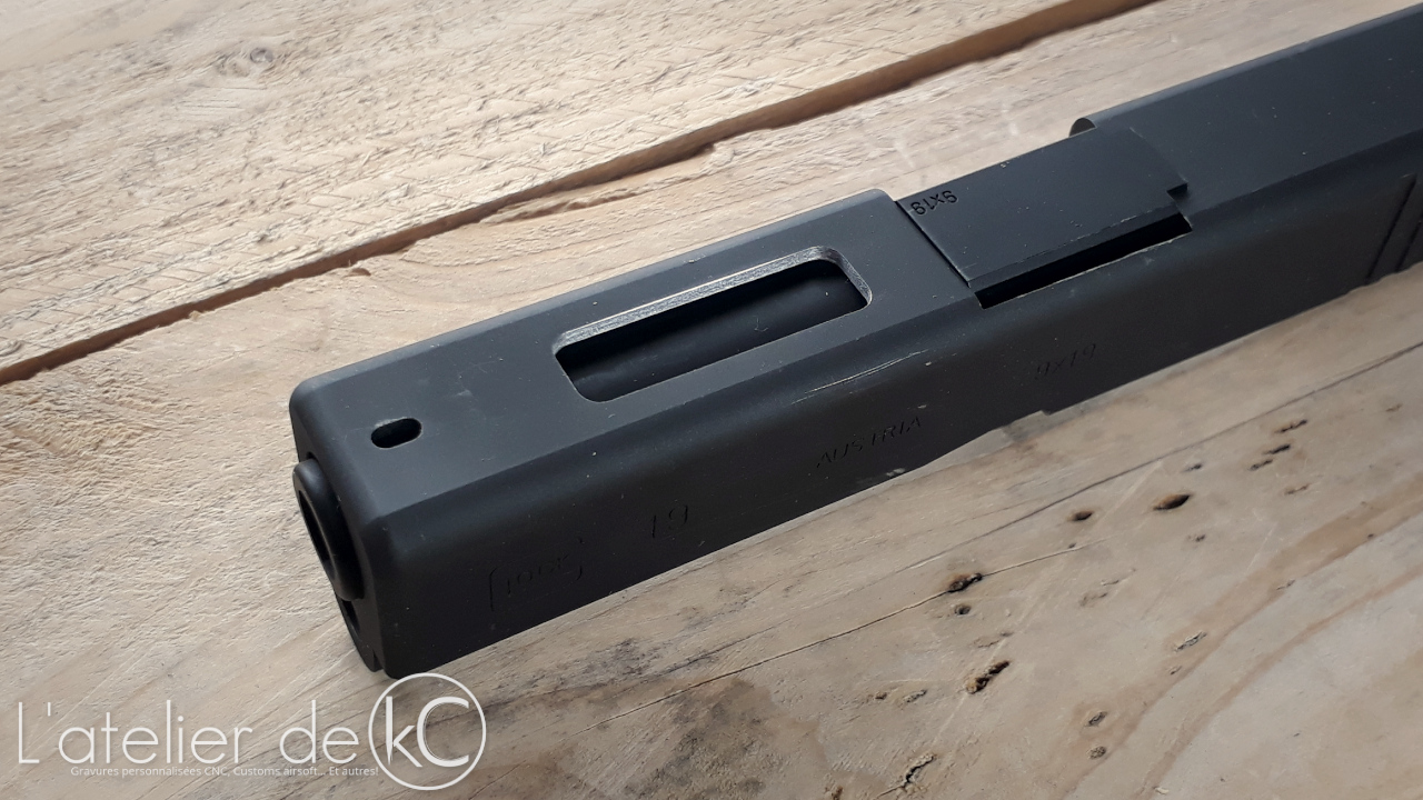 Aujourd’ hui pas de gravure, mais de l’ usinage! On m’a en effet confié une culasse alu PGC pour glock 19 de chez KSC, afin d’ y réaliser une découpe traversante sur le haut de la culasse.
