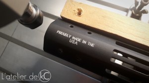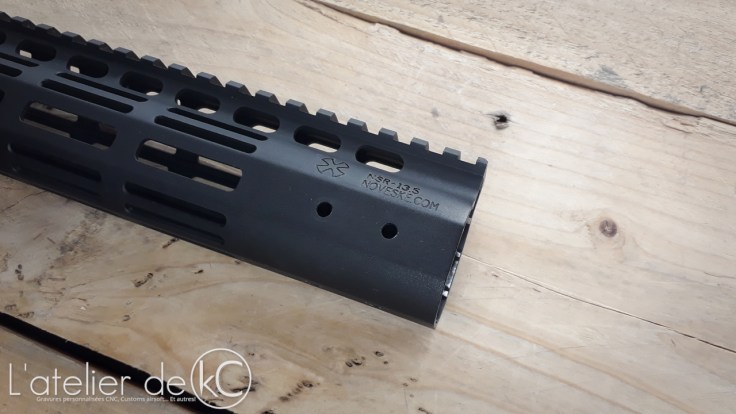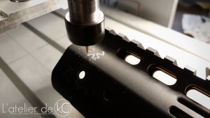Je vais donc réaliser des gravures type « Noveske NSR » sur le garde main. Plusieurs difficultés ici: La taille de la pièce, la géométrie des surfaces à graver, mais également la dureté inattendue du traitement de surface à laquelle il a fallu s’adapter.