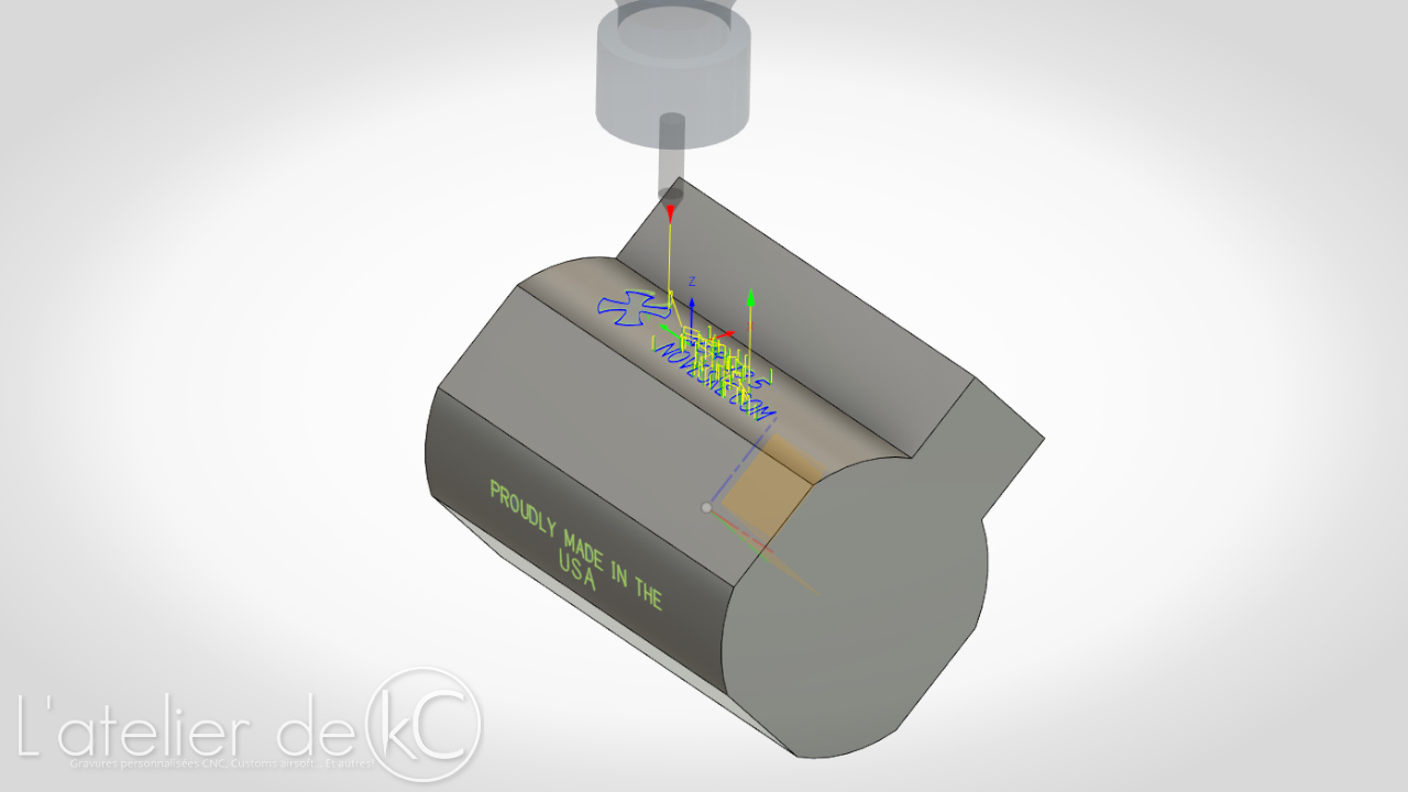 Nous avons en effet 3 surfaces différentes à graver, cylindriques, et situées à 45°, 135° et 315°. Je vais donc devoir passer par de l’ usinage « 3D », en redessinant au préalable le profil du garde main dans mon logiciel de CAO pour pouvoir y projeter les tracés des marquages et programmer mes usinages.