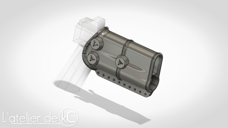 Le verrouillage de la réplique dans le holster se fera au niveau de la lampe: ainsi, le corps de la réplique n’ est même pas en contact avec le corps du holster, évitant tout risque d’ usure de la peinture custom par frottement. Ok, la peinture Cerakote est sensée résister à l’ abrasion… mais au prix du custom, je n’ ai même pas envie de prendre le risque! La majeure partie du holster ne sera en fait qu’ une « coque » de protection enveloppant la réplique, un écrin de protection 🙂