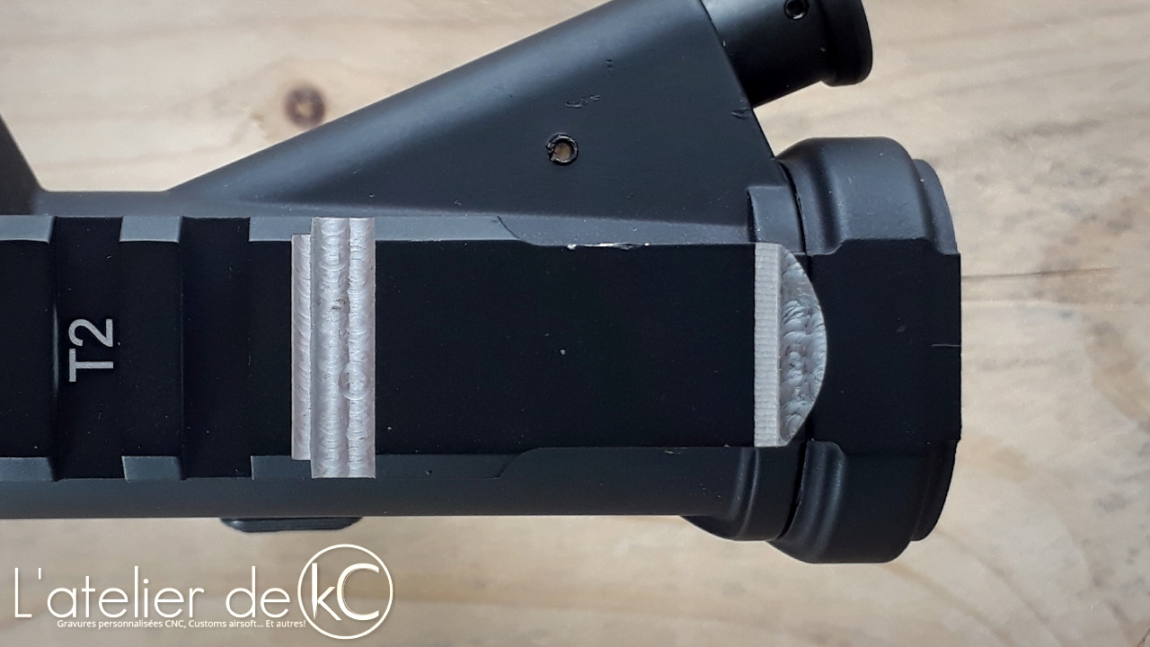Les usinages, situés sur le upper, consisteront en l’ ajout d’ une rainure supplémentaire et en la réalisation d’ un petit méplat et d’ un chanfrein, à l’ extrémité du rail supérieur.