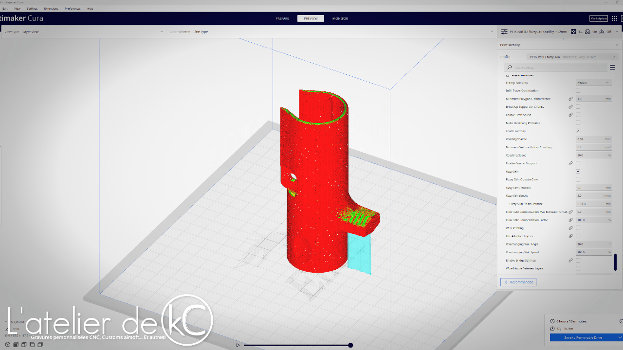 J’ai toujours ce garde main en ma possession, mais je souhaitais expérimenter depuis un certain temps la fonction « Fuzzy Skin » présente sur le slicer Cura. Je me suis donc amusé à re-dessiner ce garde-main pour le dupliquer en impression 3D!