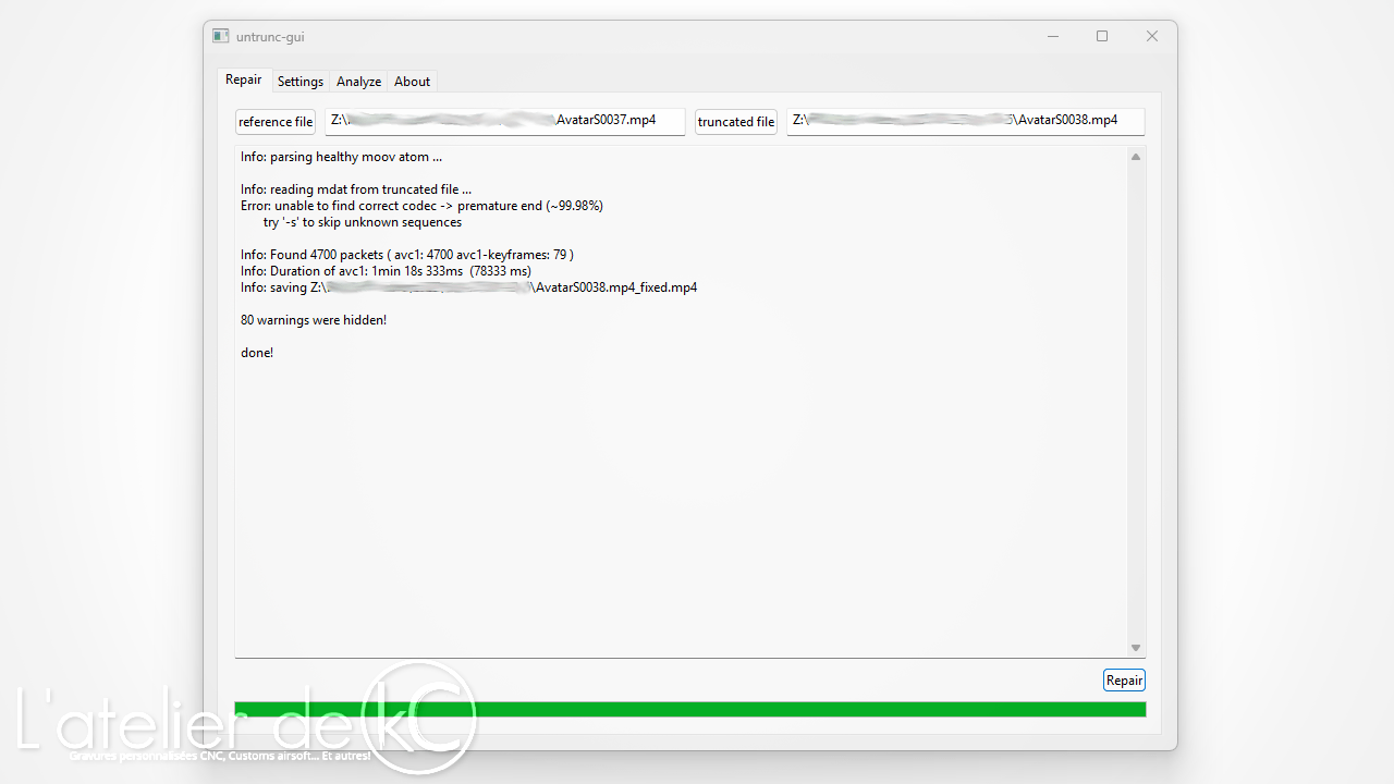 Nous allons voir ici la seule technique qui a permis de sauver le fichier dans mon cas: En utilisant le logiciel gratuit Untrunc.