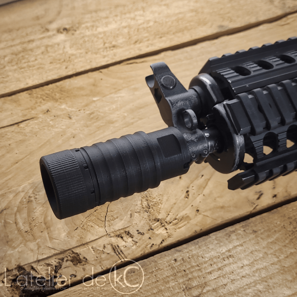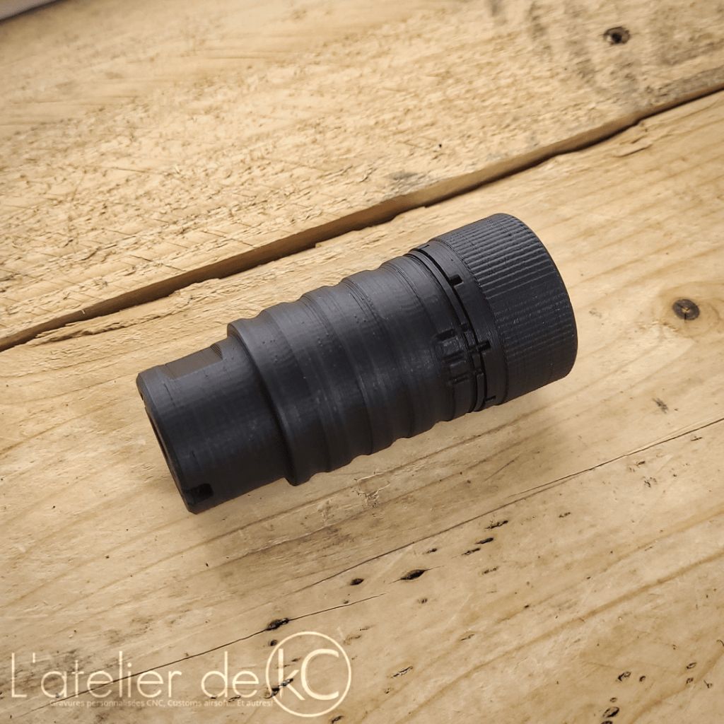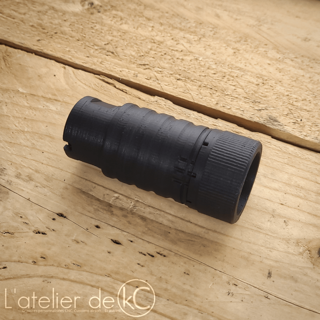 Comme il n’y a pas réellement de nécessité d’avoir ce cache flamme en plusieurs pièces en airsoft, je l’ai dessiné en une seule partie, pour plus de solidité, et également le rendre plus simple à imprimer!
