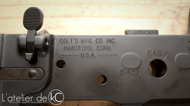 Je m’ attaque cette fois à un véritable Colt Sporter .222, pour une gravure personnalisée sur son puits de chargeur! Le Colt AR15 a2 Sporter est une version civile, « sportive », du célèbre m16a2. C’ est l’ occasion pour moi d’ admirer de véritables marquages frappés Colt 🙂