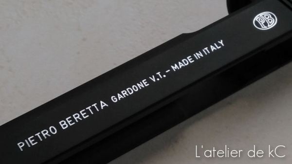 La réplique a été équipée de plaquettes Beretta, d’un outer barrel acier RATech du plus bel effet. La carcasse a reçu une peinture Cerakote et la culasse a finalement été repeinte également pour approcher le rendu « Bruniton » des vrais Beretta.
